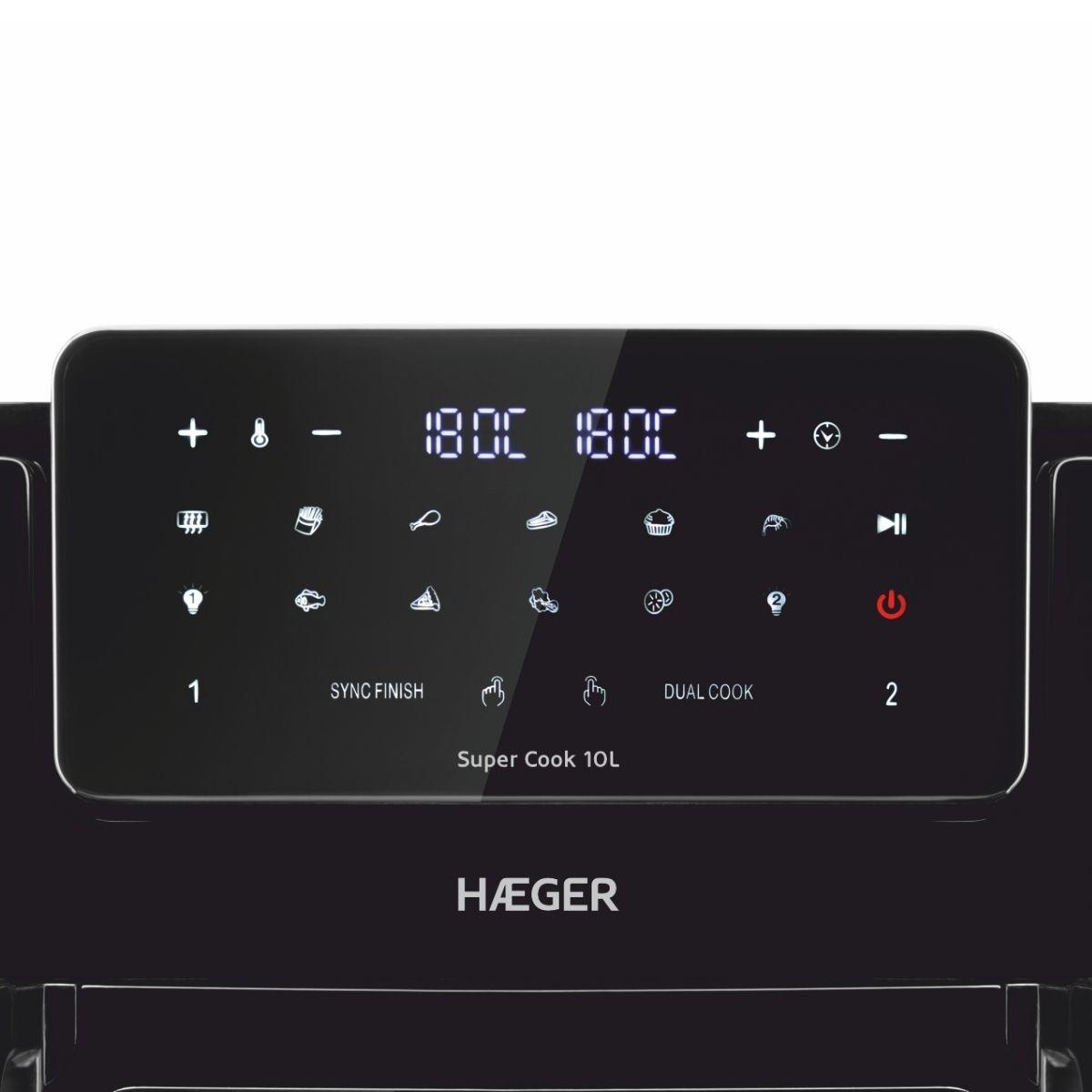 With the HAEGER Super Cook 10L Digital Oil-less Fryer, your meals will reach a new level. Thanks to the 10 cooking programmes and 360° hot air technology, you can prepare everything from crispy potatoes to succulent meats, without the need to add oil. The digital control with touch screen makes setting the time and temperature extremely easy, allowing you to adjust the temperature between 80º and 200º, ideal for different types of food.